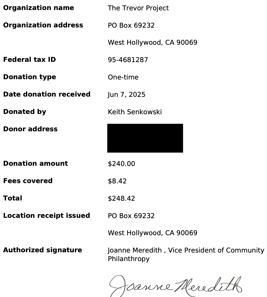Apologies for two updates in one week, but I am really excited about this. I have a great update about where the money is going from the paid tiers of membership. I'd been planning on donating money to the Trevor Project at the end of the year when non-profit organizations do most of their matching campaigns.